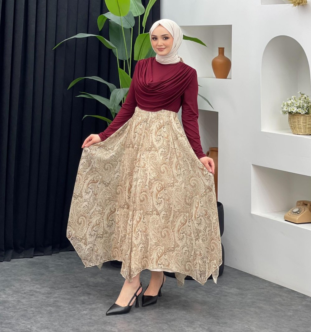 Etnik Desen Şifon Etek Bej
