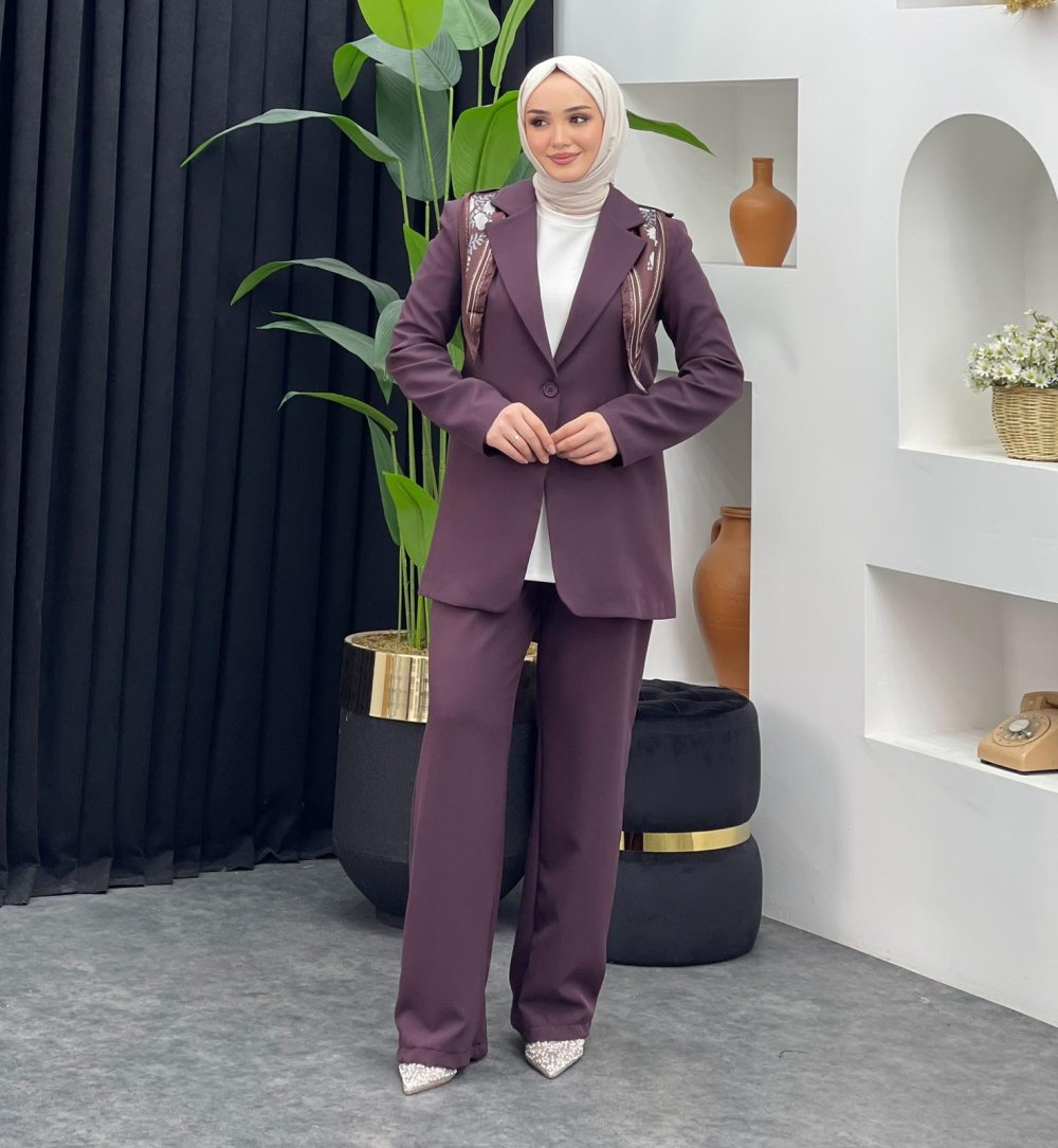 Fularlı Ceket Takım Bordo