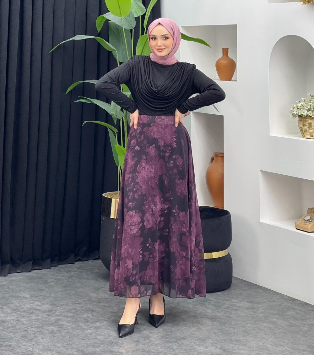 Gül Detaylı Şifon Etek Mor