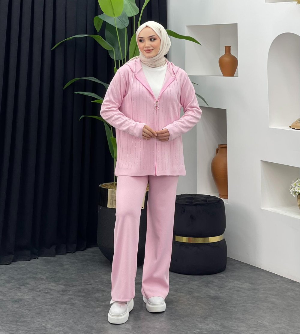 Taşlı Pantolonlu Takım Pudra